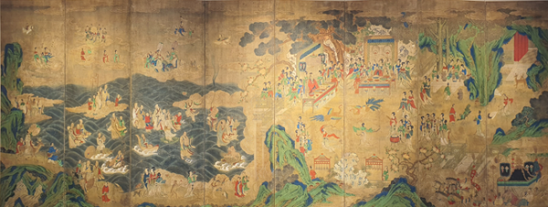 파노라마식 화면 구성에 청록의 채색기법을 사용해 화려하면서도 정교하다.