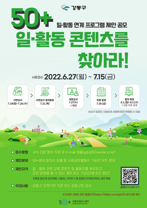 강동50플러스센터 관계자는 “이번 공모를 통해 50+세대에 필요하고 유용한 교육 콘텐츠를 효과적으로 발굴하는 기회가 되길 기대한다”며 “앞으로도 일회성 교육으로 끝나지 않고 일자리 연계 등 다양한 후속 활동으로 이어질 수 있도록 실질적 토대 구축에 최선을 다하겠다”고 밝혔다.