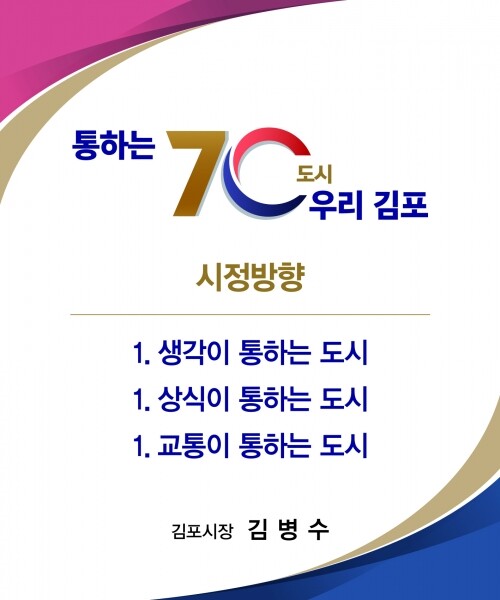 김 시장은 시민 여론 청취와 인수위원회 검토 등을 거쳐 철도교통망 확대와 지역간 균형발전으로 70만 대도시로 김포를 성장시키겠다는 의지를 담아 시정 구호를 최종 확정했다고 밝혔다.