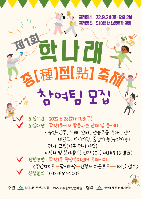 학익1동에서 활동하는 단체 및 동아리 누구나 신청 가능하며 참여분야는 공연, 전시 등이다.