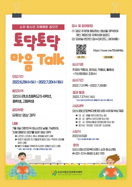 오산시정신건강복지센터 관계자는 “이번 공모전을 통해 ‘비자살성 자해’를 시도하고 있는 많은 청소년들이 부정적인 감정을 해소할 수 있는 올바른 방법을 찾게 되길 바란다”고 밝혔다.