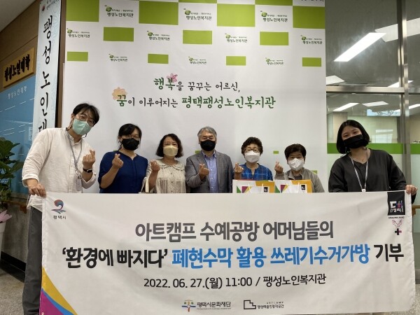 지역주민들이 합심해 골목환경을 개선하고자 폐현수막을 재활용해 쓰레기 수거 가방을 만들고 팽성노인복지관 환경지킴봉사단의 환경정화 활동에 보탬이 되고자 기증한 것이다.