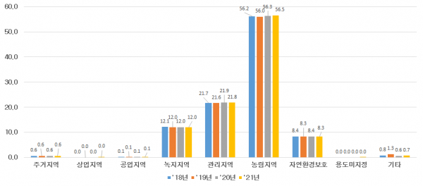 법인의 토지소유 면적은‘20년 6,965㎢ 대비 1.7% 증가한 7,087㎢로 농림지역 및 관리지역이 58.6%로 절반 이상을 차지하는 것으로 나타났다.
