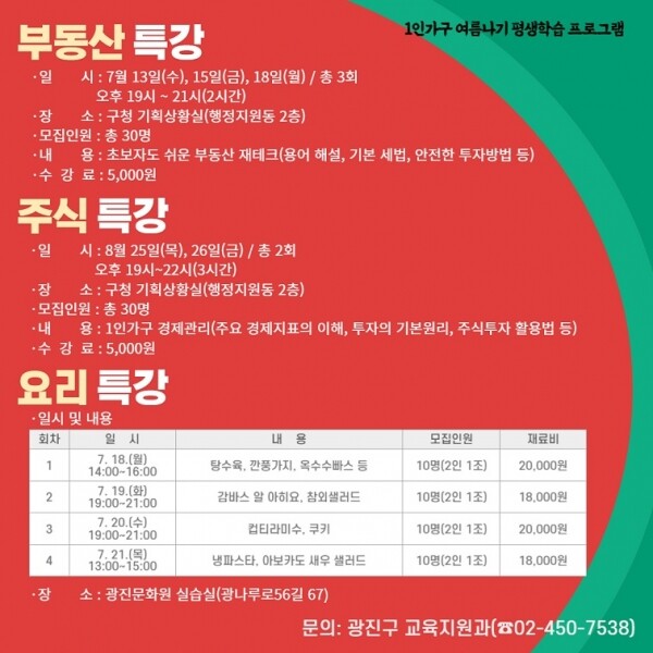 또한 8월 25일과 26일에는 1인 가구의 경제 관리를 위해 주요 경제지표의 이해, 투자의 기본 원리, 주식투자 활용법 등을 알려주는 주식 특강이 매회 15명을 대상으로 구청 기획상황실에서 진행될 예정이다.