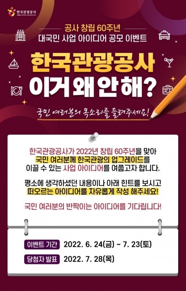 이벤트엔 대한민국 국민이면 누구나 참여할 수 있으며 공사 ‘대한민국 구석구석’ 누리집 이벤트 페이지에서 공사에 제안하고 싶은 관광부문 신규 사업 아이디어를 사유와 함께 작성, 제출해 응모하면 된다.