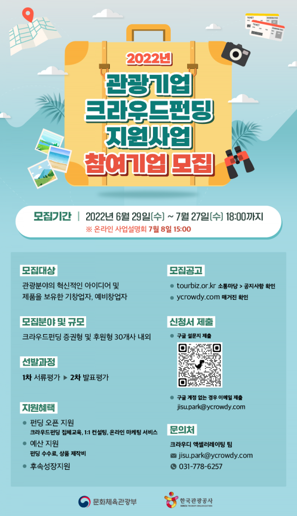 문화체육관광부와 한국관광공사는 오는 7월 27일까지 ‘2022 관광기업 크라우드펀딩 지원 사업’에 참여할 기업을 모집한다.