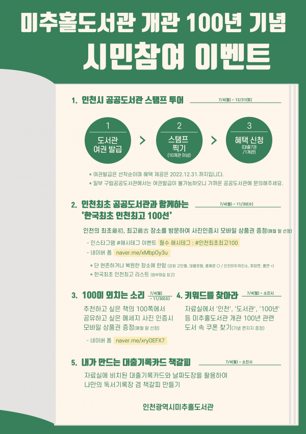 미추홀도서관 개관 100년 기념 이벤트는 7월 4일부터 올해 말까지 진행되며 인천광역시 공공도서관과 미추홀도서관 분관이 함께하는 오프라인 행사를 비롯해 추천하고 싶은 책속의 메시지를 공유하는 온라인 이벤트까지 다채롭게 구성됐다.