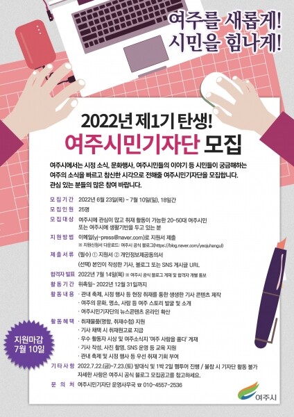 공개모집 인원은 총 25명으로 여주시에 관심이 많고 취재활동이 가능한 여주시민, 또는 여주시에 생활기반을 두고 있는 20대~50대가 대상이다.