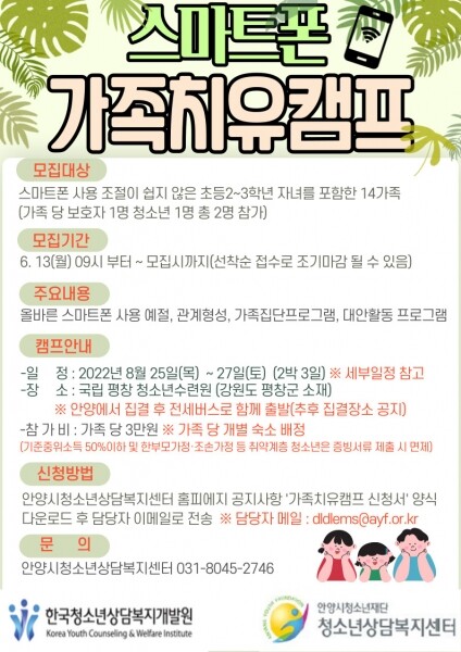 가족치유캠프는 과도한 스마트폰 사용으로 어려움을 겪고 있는 초등학교 2~3학년생이 포함된 14가족을 대상으로 진행되며 오는 8월 25일 ~ 27일 2박3일 일정으로 국립평창청소년수련원에서 운영될 예정이다.