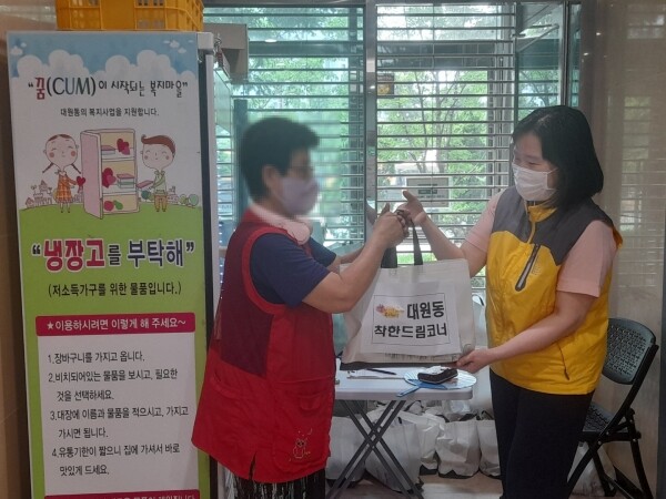 대원착한드림코너는 기존의‘국 배달’,‘반찬 나눔’과는 달리 부식 위주로 짧은 유통기한 등의 애로사항을 개선하기 위해 실시하고 있는 사업으로 저소득 취약계층의 장기간 안정적인 식생활 개선에 기여하고 있으며 월 1회 식료품을 구입해 관내 저소득 취약계층 50명에게 배부하며 안부를 확인하고 있다.