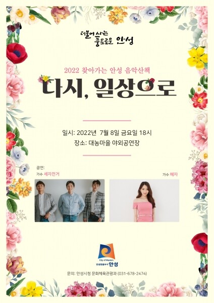 지역 주민의 문화예술 향유 기회를 확대하고자 기획된 2022 찾아가는 안성 음악산책 ‘다시 일상으로’는 다양한 장르에서 활동하는 아티스트들이 직접 안성 곳곳을 찾아가 펼치는 공연이다.