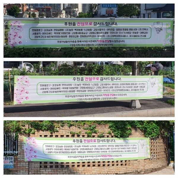 감사 현수막은 지역사회 상생을 비전으로 쉼 없는 나눔 활동을 이어가고 있는 고양동지역사회협의체의 발자취를 조명하는 한편 주민에게 ‘누구나 나눔에 참여할 수 있다’는 인식을 심어주고 있다.