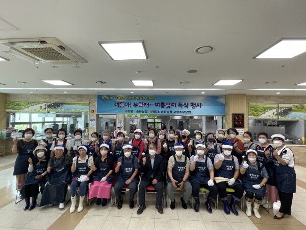 송탄농협 관계자 및 송탄농협고향주부모임 봉사자들은 함께 더위에 지친 어르신들을 위해 보양식을 직접 조리, 배식과 설거지까지 정성을 담아 나누어 드렸다.
