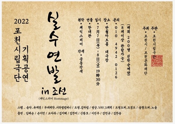 한대관 연출은 “포천시민들의 문화 향유와 더불어 놀이의 시간을 제공하기 위해 객석과 무대의 벽을 없애는 시도를 했다”며 “공연장에 온 시민들의 마음과 생활에 언제나 즐거움이 찾아오는 계기가 되도록 최선을 다해 준비했다”고 전했다.