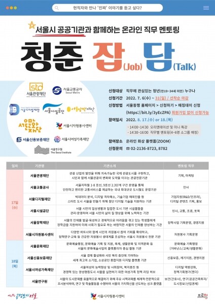 이번 멘토링은 서울관광재단, 서울교통공사, 서울디지털재단, 서울문화재단, 서울시설공단, 서울시자원봉사센터, 서울신용보증재단, 서울시여성가족재단, 서울연구원, 서울장학재단 등 서울시 공사·출연기관 10곳에서 청년들을 위해 힘을 모았다.
