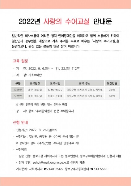 관심 있는 누구나 7월 25일부터 8월 26일까지 구청사회복지과 또는 동주민센터, 종로구수어통역센터를 통해 신청하면 된다.