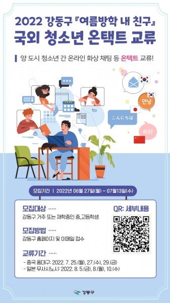 이수희 강동구청장은 “강동구 청소년들의 글로벌 역량을 강화하기 위해 이번 온택트 교류를 준비했다 이번 교류가 양 도시의 청소년들이 서로 다른 문화를 이해할 수 있는 기회의 장이 되길 바란다”며 “국외 문화 교류에 관심있는 청소년들의 많은 참여를 바란다”고 전했다.