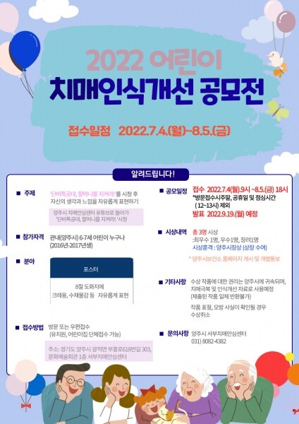 참여를 희망하는 어린이는 8절 도화지에 크레용·수채물감으로 그린 포스터와 200자 원고지 10매 이내 또는 A4 1~2매 분량의 감상문을 양주시 서부 치매안심센터로 방문하거나 우편으로 접수하면 된다.