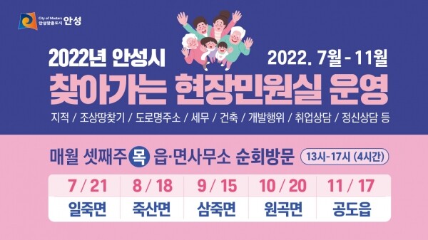 이달 21일 일죽면을 시작으로 8월에는 죽산면, 9월에는 삼죽면, 10월에는 원곡면, 11월에는 공도읍에서 진행될 예정이다.