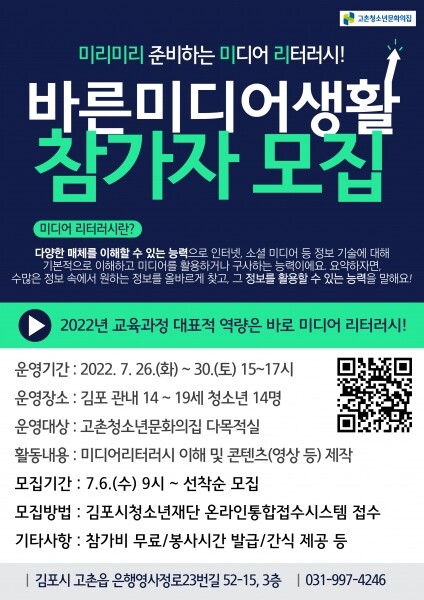 오는 7월 26일부터 30일까지 총 5일간 운영되는 ‘바른 미디어 생활’은 관내 14 ~ 19세 청소년 14명을 선착순으로 모집하며 7월 6일 수요일 오전 9시부터 김포시청소년재단 홈페이지 온라인통합접수시스템에서 신청 가능하다.