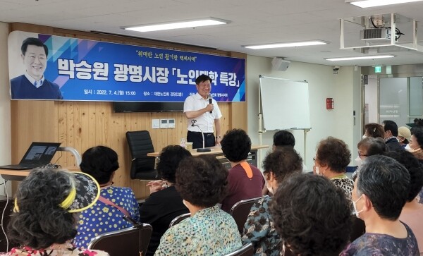 박 시장은 이날 특강에서 문화·체육 오락)사업, 광명시 시니어클럽 운영, 어르신 인생노트 사업 등 현재 시행중인 사업과 함께 무료상조 서비스 등 민선 8기 공약 사항에 대해 설명했다.