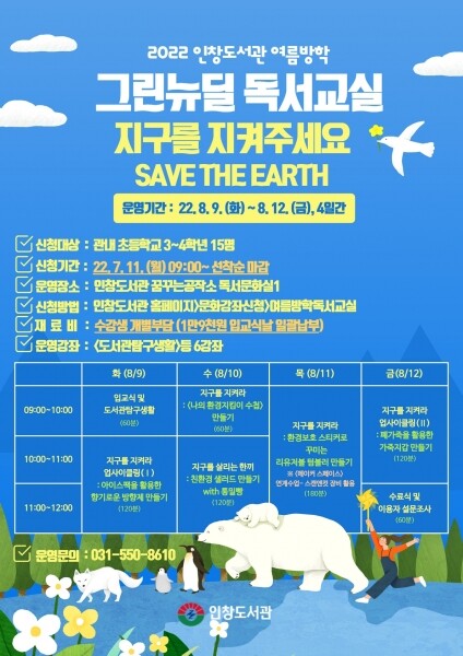 이번 독서교실은 그린뉴딜과 관련된 주제도서읽기와 다채로운 독서문화체험행사를 운영할 예정으로 그린뉴딜과 친환경에 관심있는 초등학교 3~4학년 어린이라면 누구나 참여 가능하다.