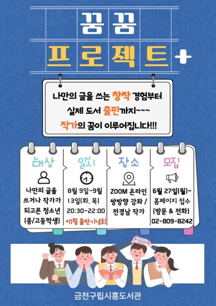 오진이 금천문화재단 대표이사는 “이 프로그램은 책이라는 매개체를 통해 청소년들에게 인성 함양의 기회를 제공하고 건전한 가치관 확립에 도움을 주고자 기획됐다”며 “창작의 즐거움을 발견하고 문학으로 소통하고 싶은 예비 작가들의 많은 참여를 바란다”고 전했다.