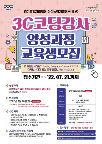 경기도 거주 미취업 여성이라면 누구나 온라인으로 신청 가능하며 서류 전형과 온라인 비대면 면접을 통해 교육생을 최종 선발한다.