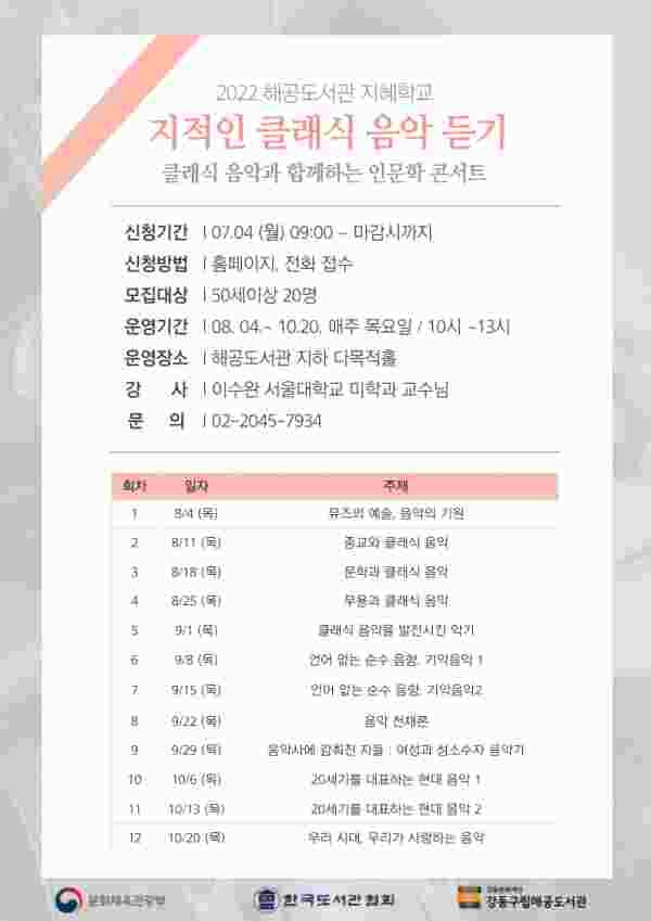 해공·암사·둔촌도서관에서는 지적인 클래식 음악듣기 공연예술과 영상문화를 통해 살펴보는 나와 타인의 삶 현대시로 배우는 공감의 지혜를 주제로 인문학적 가치와 철학을 살펴보는 시간을 가진다.