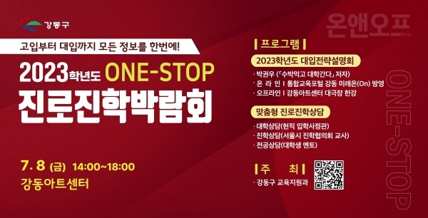 이수희 강동구청장은 “이번 2023학년도 진로진학박람회가 수험생들의 앞날에 중요한 밑거름이 되는 뜻깊은 자리가 되기를 바란다”며 “앞으로도 구는 교육의 대전환에 발맞춰 강동 미래인재 육성에 최선을 다하겠다”고 밝혔다.