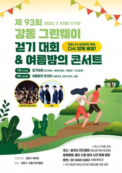9일 오후 5시 40분에 1부 ‘그린웨이 걷기대회’를 시작으로 오후 7시 30분부터는 ‘여름밤의 콘서트’가 진행돼 서울 팝스 오케스트라의 품격 있는 클래식 공연과 4인조 남성 보컬그룹 노을의 명품 발라드를 감상할 수 있다.