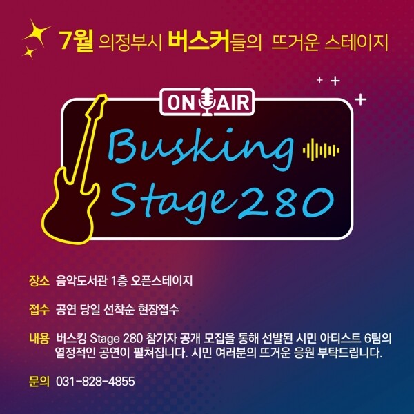 버스킹 stage 280은 공연 당일 도서관을 방문하는 누구나 자유롭게 관람할 수 있으며 기타 문의사항은 도서관 홈페이지 및 인스타그램을 참고하거나 음악도서관 담당자에게 문의하면 된다.