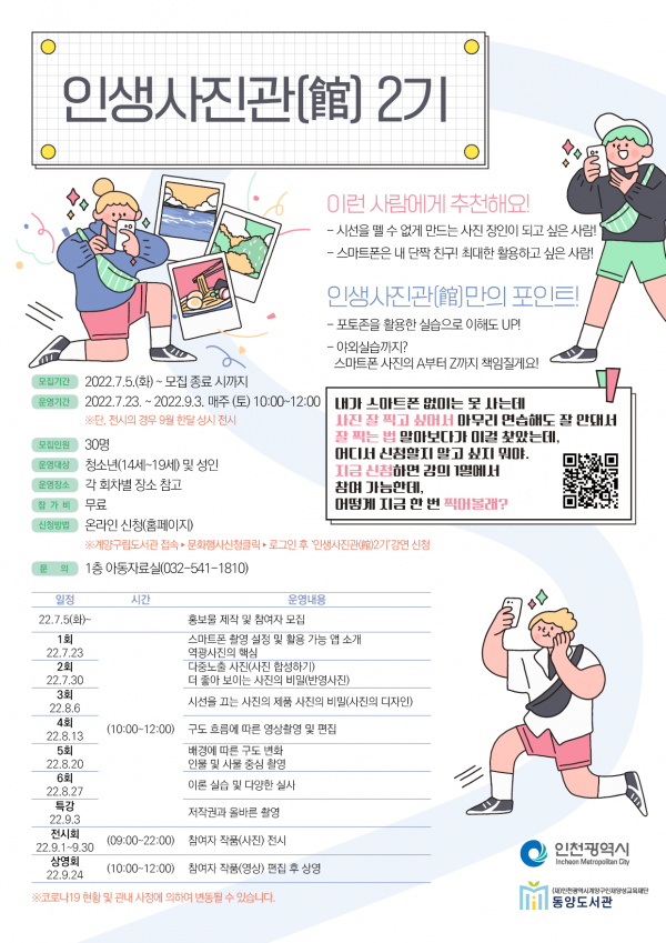 ‘인생사진관 2기’는 오는 7월 23일부터 9월 3일까지 매주 토요일 오전 10시부터 12시까지 총 6회 운영되며 한 번의 특강이 진행된다.