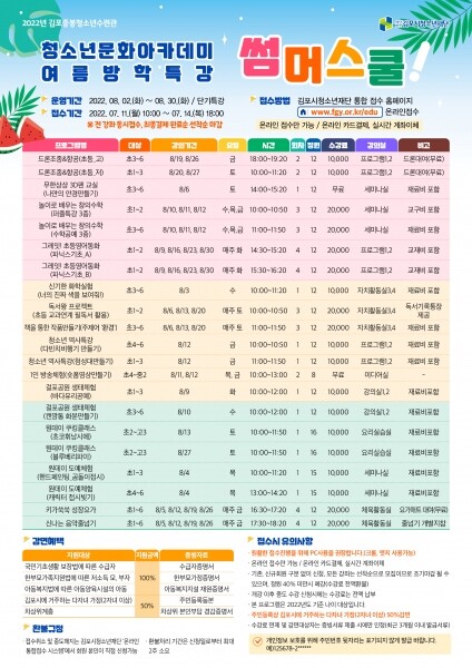 조성훈 김포중봉청소년수련관장은 “청소년 교육사업의 거점으로서 창의융합, 평생학습, 문화예술, 생활체육 등 분야별 특화된 여름특강을 준비했으며 김포시 청소년들의 교육욕구 해소와 다양한 소질계발의 시간이 되길 바란다”고 말했다.