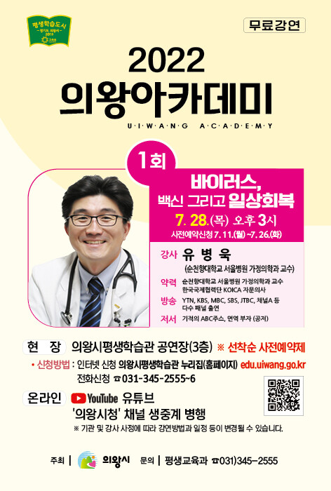 올해 첫 번째로 개최하는 의왕아카데미의 강연은 순천향대 유병욱 교수를 초청해 ‘바이러스, 백신 그리고 일상회복’이라는 주제로 새로운 바이러스와 인류가 공존할 수 있는 방법을 의왕시민들에게 전달한다.