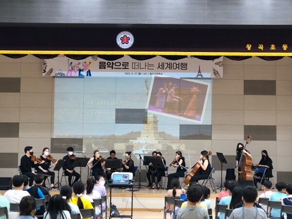 경기도와 의왕시가 추진하는 ‘찾아가는 문화활동 음악회'는 문화소외 시설 및 학교 등을 우수한 예술 공연단체가 방문해 공연을 선보이는 사업으로 올해는 의왕 챔버 오케스트라가 왕곡 초등학교를 방문해 코로나로 인해 공연을 접하기 힘들었던 초등학생들에게 문화체험의 기회를 제공했다.