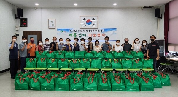 여름 김치 꾸러미는 김치 3kg을 비롯해 비비고 삼계탕 800g 2봉지, 홈키파 에어졸 1묶음, 덴탈마스크 1박스, 타포린 가방 1개, 라면 1묶음으로 구성됐으며 관내 독거노인, 장애인, 한부모 가정 등에 전달됐다.