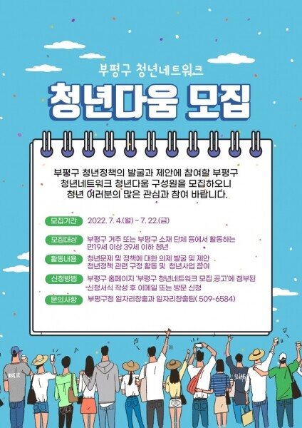 차준택 구청장은 “코로나19로 움츠러들었던 일상이 서서히 회복됨에 따라 청년들의 사회참여도 활발해지길 바란다”며 “청년네트워크 ‘청년다움’ 모집에 부평구의 내일을 만들어가는 청년들의 많은 참여를 바란다”고 말했다.