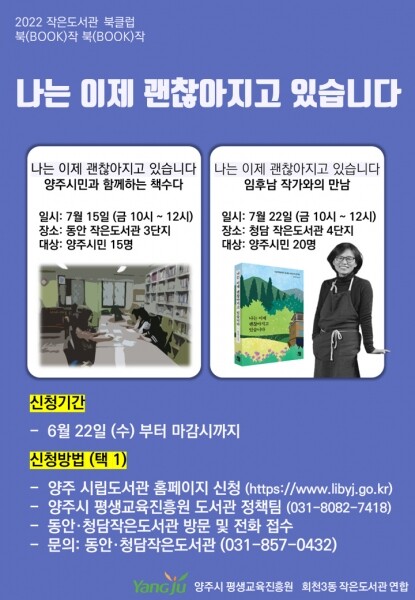 이번 북클럽은 회천3동에서 운영 중인 도서관 5개소가 연합해 임후남 작가의‘나는 이제 괜찮아지고 있다’를 선정, 독서토론과 작가와의 만남을 운영할 예정이다.