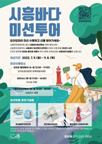 참가 방법은 시흥전자관광지도에 접속해 스탬프투어 코스 중 ‘시흥바다 미션투어’를 선택하고 미션 장소인 오이도 등대공방?오아시스함상전망대)-시흥 오이도 박물관에 방문해 발급된 모바일 완주증과 함께, 미션 수행 후 미션장소에 비치된 스탬프가 모두 찍힌 미션지를 촬영한 사진을 네이버 폼으로 제출하면, 완주 기념품을 선착순으로 제공한다.