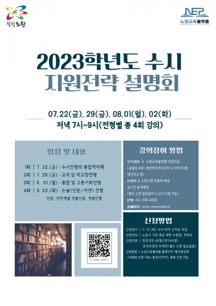 설명회는 7. 22., 7. 29., 8. 1., 8. 2. 19시~오후 9시, 2시간씩으로 총4회에 걸쳐 노원교육플랫폼 대강의실에서 진행된다.