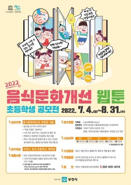 공모주제는 음식을 남기거나 버리지 않기 먹을 만큼만 덜어먹기 너무 짜고 달게 먹는 식습관의 안 좋은 점 등 음식문화개선에 대한 내용이며 부천시 소재 초등학교 재학생이면 누구나 응모할 수 있다.