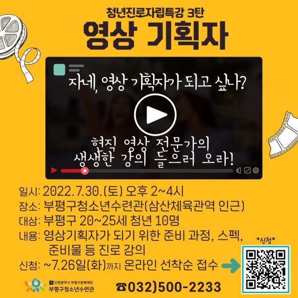 이번 ‘진로자립특강 영상기획자편’은 오는 30일 청소년수련관에서 현재 영상전문가로 활동하고 있는 ‘손안의 공장’ 이승진 대표가 진행하는 강의다.