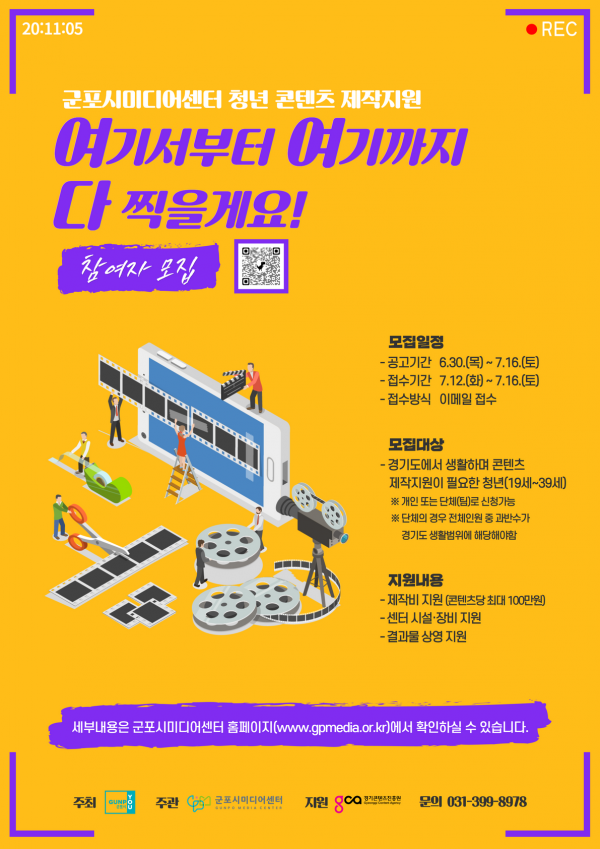 지원자는 군포시미디어센터 시설뿐만 아니라 장비·시설 임차비부터 콘텐츠 제작에 필요한 소품 및 외부 전문 인력 섭외비 등 최대 100만원을 지원받게 될 예정이다.