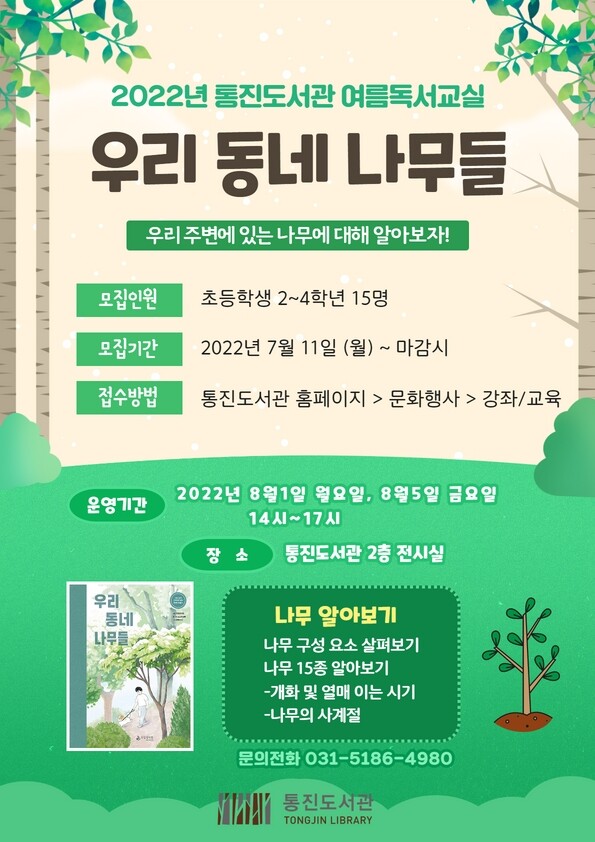 [뉴스써치] 김포시 통진도서관은 8월 1일 월요일과 8월 5일 금요일 오후 2시 통진도서관 2층 전시실에서 2022년 여름독서교실 ‘우리 동네 나무들’을 운영한다.