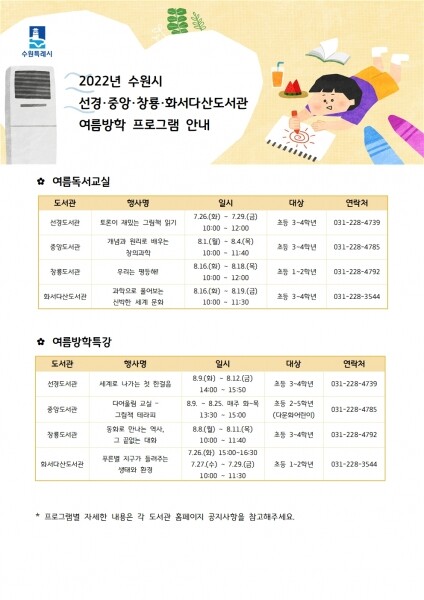 수원시 관계자는 “여름방학을 맞아 어린이들이 즐겁게 참여할 수 있는 독서 프로그램을 마련했다”며 “많은 관심과 참여를 부탁드린다”고 말했다.