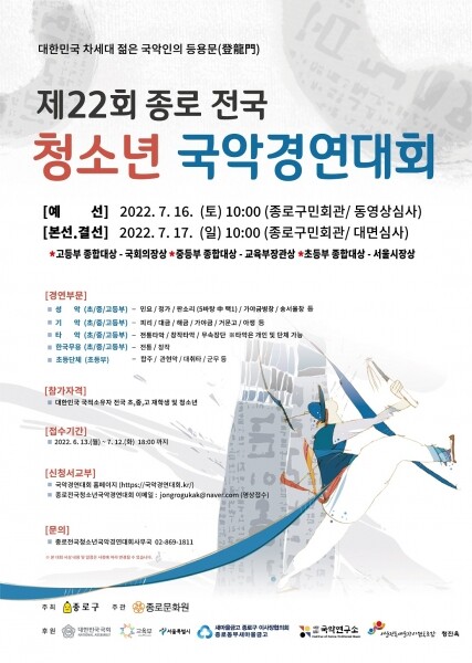 7월 16일과 17일 종로구민회관 창신아트홀에서 열리는 이번 대회는 코로나19 확산 이후 3년 만에 대면 행사로 선보이게 된 만큼, 국악을 사랑하는 전국 청소년들이 그간 갈고 닦은 기량을 아낌없이 무대 위에 쏟아낼 수 있도록 심혈을 기울여 준비했다.