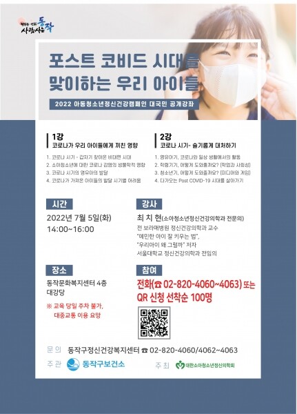 이번 강의는 동작구 보건소와 대한소아청소년정신의학회가 공동 주관해 코로나로 학교생활에 어려움을 겪는 아동 청소년을 건강하게 교육할 수 있는 방법을 안내했다.