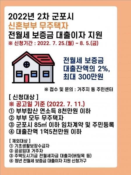 공고일 기준으로 금융기관 대출을 선행한 신혼부부는 오는 7월 25일부터 8월 5일까지 거주지 동 행정복지센터에 신청해야 한다.