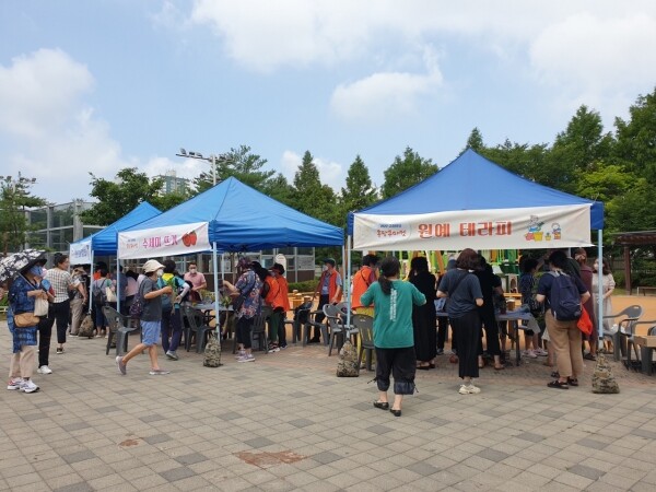 홍당무 마켓은 지역주민이 모여 함께 배우고 공유하는 문화 체험 행사로 꾸려졌는데, 특히 사업을 맡은 문화예술분과 분과원들의 재능기부로 운영된 수세미 뜨기 체험 부스가 눈길을 끌었다.